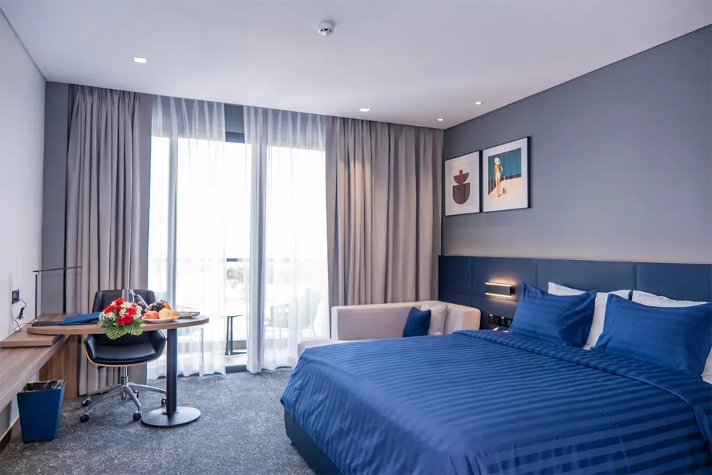 Shampoo and Conditioner, Shower Gel, Hand Soap, Body Sponge, Shower Cap, Toothbrush kit, Shaving kit, Hairbrush, Sanitary Bag, Cotton Swab, Bath Towel, Face Towel, Hair Dryer, Bathrobe, Slippers, Mineral Water